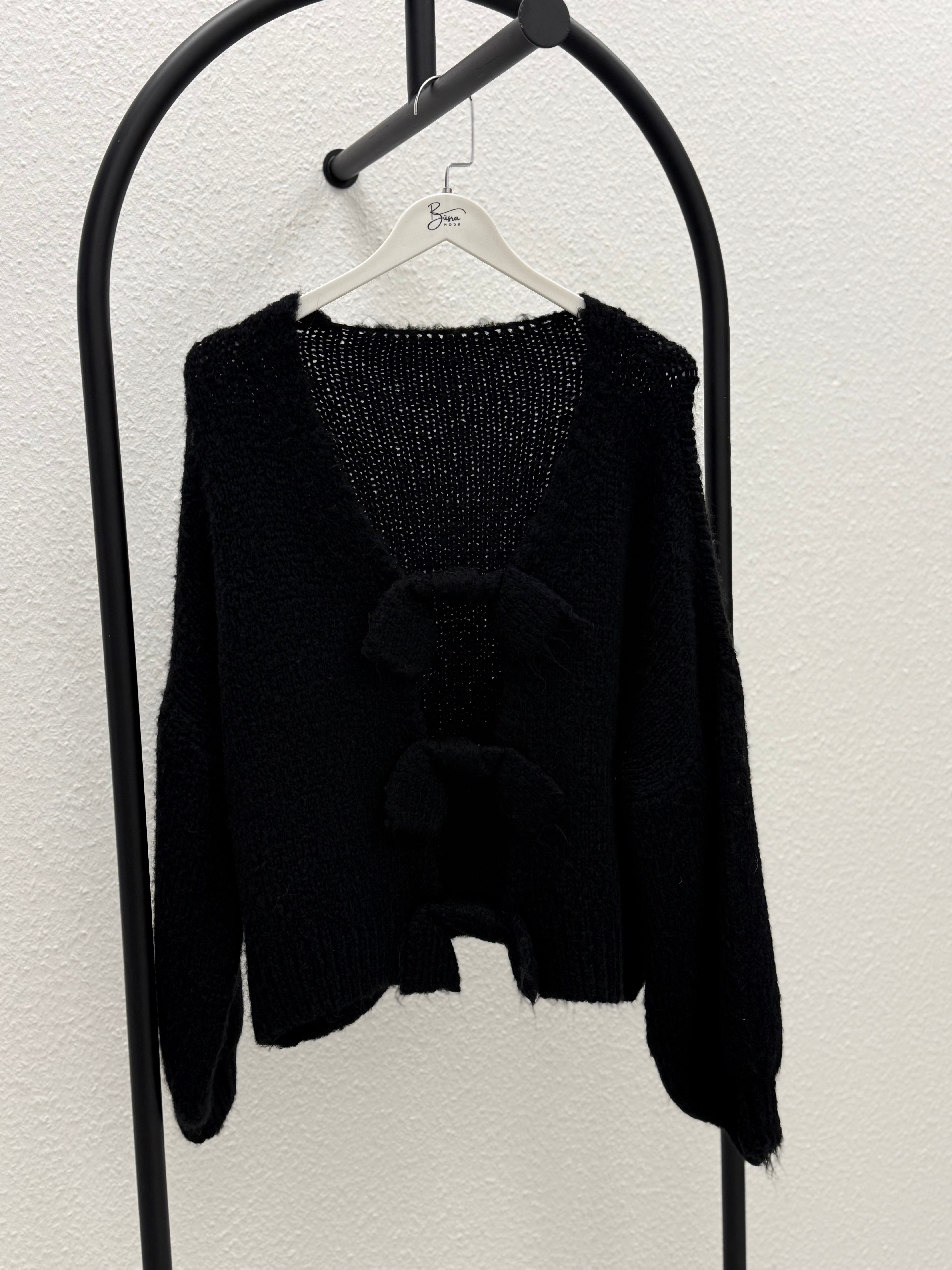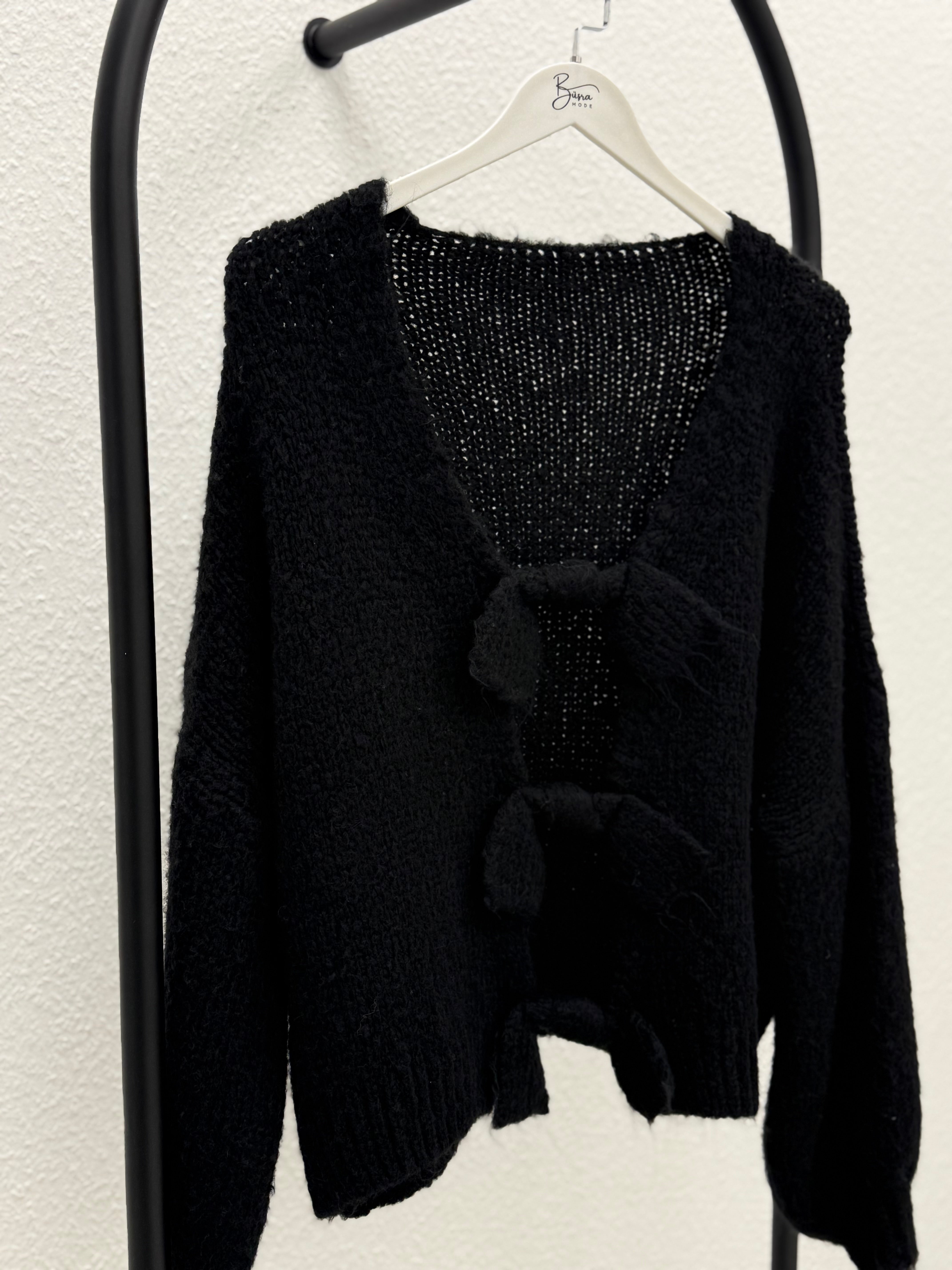 Weiche, gemütliche Strickjacke in Schwarz mit tiefem V-Ausschnitt und dekorativen Schleifen zum Binden vorne.